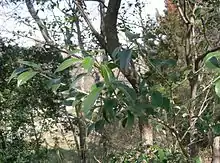 Vaccinium bracteatum, the sea bilberry or Asiatic bilberry, is a species of Vaccinium native to Japan, the Ryukyu Islands, Korea, southeast and south central China, Hainan, Taiwan, mainland Southeast Asia, Java, and Sumatra.[2] It is a small tree or large shrub, with dark purple edible fruit. It is in semi-cultivation in China. Local people collect and consume the fruit, and in addition extract a bluish-violet dye from the leaves, which is used as a hair dye, for coloring vinegar, and in cooking. The dye turns black when cooked with rice, providing culinary interest.[3][4]