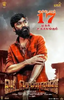 Vetrimaaran worked on the post-production of Vada Chennai, assembling the final cut of the film during mid-May 2018.[102] In June 2018, the makers confirmed that Vada Chennai will be released theatrically on the occasion of Ganesh Chathurthi (13 September 2018).[103] The official teaser for the film was unveiled on the occasion of Dhanush's birthday (28 July 2018) and received positive response from fans.[104][105] Furthermore, celebrities such as Shah Rukh Khan and Anurag Kashyap praised Dhanush and Vetrimaaran's work in the teaser.[106][107] The makers unveiled a set of posters featuring the lead characters starting from 6 August 2018.[108] In mid-August, Dhanush announced that Vada Chennai, will be released worldwide on 17 October 2018, coinciding the Dusshera weekend.[109] The official merchandise of Vada Chennai, was launched by Cover It Up and Fully Filmy on 15 October 2018, as a part of the film's promotion.[110][111] The film was premiered at the Pingyao International Film Festival in China before the theatrical release.[112][113] Vada Chennai was also premiered at the 23rd International Film Festival of Kerala.[114]