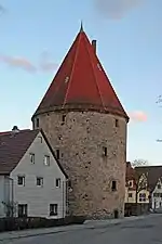 The Haspelturm, also called "a thief's tower" is the oldest tower in Vaihingen. An old roman ornament ("Rundbogenfries") indicates that it might have been built as early as the 13th century. The tower's six stories dominate the old town's silhouette. In the first floor the "Haspel," a kind of pulley that was used to lower its prisoners into the dungeon, can be found.