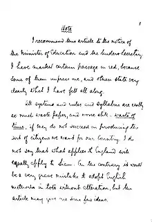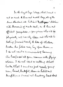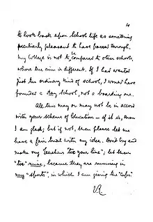 At the Mahadlek College, what I want is that Education should mean the turning of a boy into a fine young man and a good citizen, not to crush out all individuality under the weight of Syllabus and System! and I want Education to be interesting to the boys so that they would in later days be able to look back upon School life as something peculiarly pleasant to have passed through. My College is not to be compared to other schools, where the aim is different. If I had wanted just the ordinary kind of school, I would have founded a day school, not a boarding one." [1]