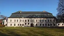 Valašské Meziříčí has a small historic centre formed by the town square and its surroundings, including the Žerotín Castle. The town square is lined by preserved burger houses.[2] One of the most valuable monuments of the historic centre is the parish Church of the Assumption of the Virgin Mary. The originally Gothic church was first mentioned in 1419, after it replaced an old church from the 13th century. The Renaissance tower with a portal was added in 1581 and the Baroque Chapel of the Virgin Mary was added in 1681–1682. In the mid-18th century, the church was baroque rebuilt.[7]