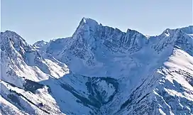 Valenciennes Mountain is a 3,150-metre (10,335 ft) mountain summit located in the Canadian Rockies of British Columbia, Canada. Valenciennes Mountain is situated at the head of Valenciennes River, one kilometre west of the British Columbia-Alberta border, and the same distance outside the Banff National Park boundary. Arras Mountain is 6 km (3.7 mi) to the west, and both are in the Kootenay Land District. The peak was named in 1920 for the French town of Valenciennes, which was captured by the Allies and entered by Canadian Expeditionary Force troops on 2 November 1918 following intense fighting in World War I.[6] The name was officially adopted in 1930 when approved by the Geographical Names Board of Canada.[5] Canadian soldier Hugh Cairns was awarded the prestigious Victoria Cross for conspicuous bravery during the battle. The first ascent of the mountain was made in 1934 by H. S. Kingman and J. Monroe Thorington, with guide Rudolph Aemmer.[1]