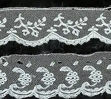 Valenciennes lace is a type of bobbin lace which originated in Valenciennes, in the Nord département of France, and flourished from about 1705 to 1780.[1][2][3] Later production moved to Belgium, in and around Ypres.[3][4][5] The industry continued onto the 19th century on a diminished scale.[3] By the 19th century Valenciennes lace could be made by machine.[1]