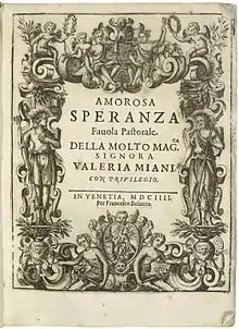 Miani's first pastoral drama, Amorosa Speranza was published in 1604.[8] It took Miani six years to have her play published, having submitted it to her publisher in 1598. Her publisher and editor Francesco Bolzetta had the play in his possession for years before he decided to put it into print.[9] Bolzetta was the primary publisher for the Ricovrati of Padua, the same academy which Miani was in contact with.[10] By publishing Amorosa Speranza, Miani became the third woman in Italy to have ever published a nonreligious play. The play Amorosa Speranza appears to have not been written for print, but rather for performance. Multiple times during the play the performer addresses the audience, even so much as having the prologue of the performance primarily spoken to the audience.[10] The plot of Amorosa Speranza revolves around the life of the virtuous sprite Venelia, who has been abandoned by her husband following their wedding night. Venezia struggles throughout the play to rid herself of the unwanted advances of two shepherds, Alliseo, and Isandro.[10]