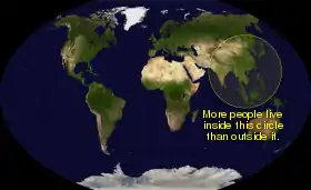 In 2015, the circle was tested by Danny Quah, who verified the claim but moved the circle slightly to exclude most of Japan, and used a globe model rather than a map projection as well as more specific calculations. He calculated that, as of 2015, half of the world's population lived within a 3,300-kilometer (2,050 mi) radius of the city of Mong Khet in Myanmar.[1]