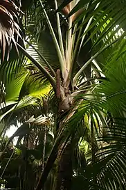 The park is the habitat for endemic coco-de-mer, which is reported as the "flagship species of global significance" growing to a height of 25–34 metres (82–112 ft). It is fan-shaped with leaves 7–10 metres (23–33 ft) long and 4.5 metres (15 ft) wide, and its petioles (stems) are 4 metres (13 ft) long. The tree bears the largest double nut with the largest seed, among the species of the plant biodiversity found in the world; the weight of its largest fruit was 42 kilograms (93 lb).[3][9] This tree is made up of stilt roots and has its canopy formed by leaves. The roots and the trunk are not easily distinguishable and they bear fruits of round and oval shape.[7] There are five other endemic palm species; millionaire's salad (Deckenia nobilis), thief palm (Phoenicophorium borsigianum), Seychelles stilt palm (Verschaffeltia splendida) latanier millepattes (Nephrosperma vanhoutteanum) and latanier palm (Roscheria melanochaetes). These six species of palms are not only unique to this reserve but also to the Seychelles, and are not found anywhere else in the Indian Ocean in its pristine ancient state of evolution. The forest is dense with Pandanus screw palms and broad leaf trees. Chrysobalanus icaco Cocoplum is also reported. The aesthetic beauty of this natural palm forest is a grand display of an array of green, red and brown palm fronds.[2] Some amount of supplementation has occurred in the plantation of these species of palms with the only intent of maintaining the ecosystem.[9] There are some 4000 palm trees in the park (5,000 is also mentioned of equal number of male and female species).[4] Two other endemic trees in the park are Dillena furruginea also known as bwa rouz and Northea hornei or the Kapisen. Takamaka trees are the entrance to the park and when they flower Seychelles sun birds feed on the nectar of the flowers.[7] Shy tenrec have been introduced into the park from Madagascar.[4]
