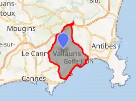 Vallauris (French pronunciation: [valoʁis][2]) is a commune in the Alpes-Maritimes department in the Provence-Alpes-Côte d'Azur region in southeastern France. It is located in the metropolitan area, and is today effectively an extension of the town of Antibes, bordering it on its west side. The seaside town Golfe-Juan is a part of the commune of Vallauris.