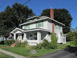 The Vallée Family House is located on the east side of Monroe Avenue, a residential side street east of downtown Westbrook. It is a fairly typical American Foursquare house, roughly square in shape and two stories in height, with a hip roof and clapboard siding. A hip-roof dormer projects from the front-facing roof face, and a single-story hip-roof porch extends across its front. A gable projects over the front steps, with false half-timbering in the gable, and large decorative brackets as support. The interior follows a side hall plan.[2]