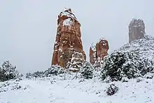 The Valley of the Gods may be toured via a 17-mile (27 km) gravel road (San Juan County Road 242) that winds around the formations. The road is rather steep and bumpy in parts but is passable by non-four-wheel drive vehicles in dry weather. The western end joins Utah State Route 261 shortly before its 1,200-foot (370 m) ascent up Cedar Mesa at Moki Dugway, while the eastern end starts nine miles (14 km) from the town of Mexican Hat along U.S. Route 163 and heads north, initially crossing flat, open land and following the course of Lime Creek, a seasonal wash, before turning west toward the buttes and pinnacles.[1] In addition to the gravel road, the area is also crisscrossed by off-road dirt trails.