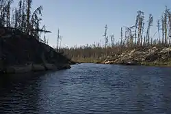 The remote creek flows through Churchill River Upland portion of the Midwestern Canadian Shield forests and is surrounded by mixed forest with stands of black spruce, white spruce, jack pine, and trembling aspen. The shoreline is characterized by steeply sloping irregular rock ridges and poorly drained areas of muskeg.[1]