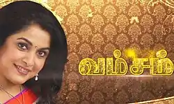 Vamsam was a 2013-2017 Indian Tamil-language family soap opera starring Ramya Krishnan, Urvashi, Sandhya Jagarlamudi, Sakthi Saravanan, Sai Kiran and Bharath Kalyan. It replaced Rajakumari and it broadcast on Sun TV on Monday through Saturday from 10 June 2013 to 18 November 2017 for 1338 Episodes.[1][2]