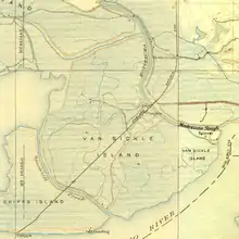The island, historically, was referred to by a number of names, including "Jones Island", "Van Sickle Island", "Van Sickles Island" and "Van Sickle's Island".[1] It is shown as "Jones Island" on an 1850 survey map of the San Francisco Bay area made by Cadwalader Ringgold,[13] as well as an 1854 map made by Henry Lange.[14] However, an 1891 decision by the Board on Geographic Names Decisions established its name as Van Sickle Island.[1]