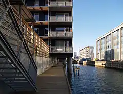 The conversion of the Torpedo Boat Shipyard at Holmen, Copenhagen into a block of flats at the turn of the millennium (2001–03), became exemplary in the way the designers created a unique place for living.[2] The steel and concrete Torpedo Hall, constructed in 1954, served as a maintenance hall for torpedo boats. In the conversion the architects left the structural elements intact to emphasize the architecture of this 155 meter long building. Instead, a new independent concrete structure has been built, which has the same five meter grid as the columns in the old hall but, shifted by 40 centimeters. The 67 apartments located in the building range from 83 m² to 275 m².[6]