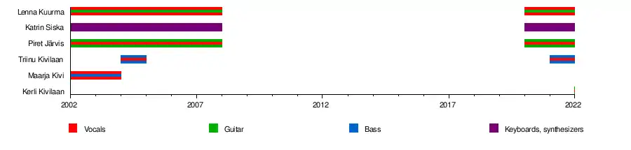 The band was originally a four-piece group consisting of Maarja Kivi, Lenna Kuurmaa, Katrin Siska and Piret Järvis. Maarja Kivi left the group in 2004 and was replaced by Triinu Kivilaan. In December 2005 she also left the group to start a solo career and finish school, and the band decided to continue as a three-piece act. Triinu rejoined for their 2021 album 'Encore'. Katrin and Triinu left the band 2022.[6]