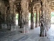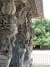 The main sanctum faces west and can be entered through a 130-feet-tall, 7-tiered rajagopuram (main gateway tower).[4] The image of the presiding deity is designed in such a way that on the 15th day after Chitra Purnima, the rays of the Sun fall on the idol.[25] The hill, called Hastagiri, is 360 m (1,180 ft) long by 240 metres (790 ft).[26] The eastern gopuram is taller than the western gopuram, which is contrasting to large temples where the rajagopuram is the tallest one.[4] One of the most famous architectural pieces in the temple is the huge stone chain sculpted in a single stone.[27] There is a 100 pillared hall[28] which has sculptures depicting Ramayana and Mahabharata. It is a masterpiece of Vijayanagara architecture.[21][27]