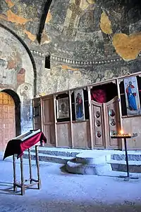 Both church and narthex are painted; these paintings are of "crucial significance in the development of the Medieval Georgian mural painting".[3] Its patron, Rati Surameli, is commemorated in a donor portrait on the north wall; the accompanying inscription reads "Mother of God, accept ... the offering of your servant Rati, eristavi of Kartli, who has zealously decorated this holy church to your glory".[5] On the same north wall are portraits of the royal founders, Giorgi III and Tamar, holding the church model. Both are dressed in Byzantine ceremonial clothes, in crowns, with halos. Tamar lacks the ribbon that is the attribute of a married woman and her inscription includes the formula "God grant her a long life", while that of Giorgi does not; this helps date the paintings to between Giorgi's death in 1184 and Tamar's marriage in 1186.[5] The depiction of Tamar is the earliest among the four known. Episodes from the life of Christ occupy the vaults and upper walls in a sequence, starting with the Annunciation, followed by the Nativity, Presentation in the Temple, Baptism, Transfiguration, Raising of Lazarus, Triumphal Entry into Jerusalem, Last Supper, Washing of the Feet, Crucifixion, Harrowing of Hell, Ascension, Descent of the Holy Spirit, and Dormition (the church is sometimes known as the Church of the Assumption, which corresponds with the Orthodox Feast of the Dormition).[5][8] At a lower level, more accessible as intercessors, are paintings of saints and stylites. On the rear wall of the sanctuary, behind the altar, are Twelve Church Fathers. In the narthex are scenes of the Last Judgment, Bosom of Abraham, Angels bearing a Medallion with the Cross, and three scenes from the life of Saint Stephen; other paintings were lost in the 1283 earthquake.[5] The paintings are not frescoes, but executed in secco, and "testify to contacts with the Christian Orient and the Byzantine world, but applied using local artistic traditions".[7] The walls were painted by an artist Georgi, whose name is written in the altar part.[6]