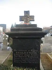 He was buried in the cemetery of the Orthodox community around the Annunciation Church[11] in the pit. On his black marble funeral monument is the following inscription in Latin: „Hic quiescit in Domino BASILIUS MOGA, Episcopus graeci ritus, non unitorum tranniensis, natus Sabaeșu 19 Novembr. 1774, denatus Cibinii 17 octobris 1845, munere archipast. functus anos 34. G.H.M.H.P. p.ppt. M” ("here rests BASIL MOGA, Ununited Bishop of Greek Rite, lived in the years, born in Sebes on November 19, 1774, died in Sibiu on October 17, 1845, held 34 years the post of High Priest.”)