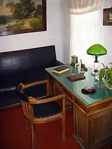 On October 17, 1954, a monument[4] was erected in Kovrov for Degtyaryov, and a bust and several plaques were installed on the territory of the weapons factory bearing his name. At the memorial for gunsmiths and designers, a bas-relief was made in his likeness. A museum was opened in Degtyaryov's house on January 6, 1978.[5] In addition, a technical school, a secondary school, a kindergarten, a recreation park, the House of Culture of Metal Workers and the former Komsomolskaya Street in Kovrov were named after him.[6] A pioneer camp near the village of Sukhanikha was named after Degtyaryov.[7] In many cities of the former USSR (Kharkiv, Novosibirsk, Lomonosov, Saint Petersburg) streets carry the name of Degtyaryov. On November 6, 1979, on the occasion of the centennial of the designer's birth, the USSR Ministry of Communications issued a postal envelope with his image.[8] January 2, 1980 in Kovrov held a special cancellation of these envelopes. On August 18, 2004, the Russian Post also issued an envelope depicting Degtyaryov.