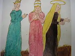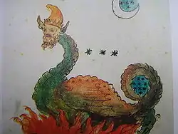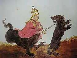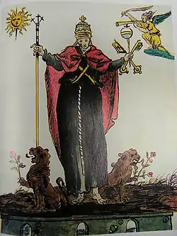 The origin of the work is clearly the fourteenth century Vaticinia de Summis Pontificibus, in which most of the images (including Image 23 opposite) are to be found. By way of example, its Image 12 corresponds to the latter's Image 9, Image 18 to 15, Image 23 to 20, Image 24 to 21 and Image 29 to 26 (note, too, the similarity of sequence).[2] A work similar to this is Marston MS 225, which can be found in the manuscript and rare-book library of Yale University, in New Haven, Connecticut, United States.[8] This manuscript comes from the German areas of Bavaria and Bohemia, probably from within the courts of emperor Frederick III and Maximilian I.