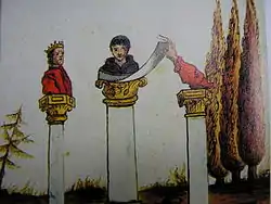 The images contain symbolic objects, letters, animals, crossings of banners, bugles, crosses, candles, three writing styles, etc., some of which seem to some to form figures similar to Roman numerals, or veiled references to personal names. As suggested by the various added inscriptions, they are supposed to have been inspired by the celebrated papal prophecies of Abbot Joachim of Fiore, a 12th-century Cistercian monk from Calabria.[7]