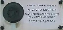 After the war he was appointed minister of finance in the restored Czechoslovakia and served in this role until 1947.[2] Šrobár also founded the Catholic Freedom Party in 1946, which later merged into the Czechoslovak National Front, and published an autobiography, Z môjho života (From My Life) in the same year. He subsequently served as minister for the unification of laws.[2] He continued in this role in the Communist government of Klement Gottwald that came to power in the Czechoslovak coup d'etat of 1948. On 6 December 1950, Šrobár died in Olomouc in Moravia and was initially buried there. His body was later reinterred in St Martin's Cemetery in Bratislava.[1]