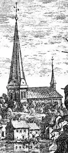 There is some question about where this church was located. The old church was either higher up in Vaxholm, slightly west of today's church, or down by Kastellsundet.[2] It was made of wood and chipboard and had a tower, 28 rows of benches and three stands. Two of the stands were intended for the citizens of the city and the crew of the third fortress.[2] It is featured in Erik Dahlbergh's book.[3]