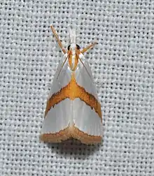 The wingspan is 15–18 mm. The forewings are silvery white with a yellow or orange median band. The hindwings are white. Adults are on wing from June to September in the northern part of the range and from March to July in Florida.[3]