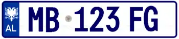 Albanian Police Vehicle registration plates in Albania have blue borders and blue texts on a white background. They follow the format [MB 000 AA], where MB stands for Ministria e Brendshme which means Ministry of Interior.