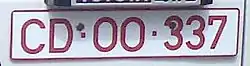 Diplomatic plates are white with red letters and usually have the format "CD-12-345" where the first number block stands for the represented country, e.g. 16 for the USA. Vehicles of the United Nations have "CD-ONU-123".