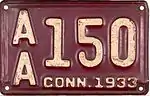 1933 | Embossed white serial on maroon plate; "CONN. 1933" at bottom | 1234 A123 A/B123 |