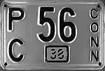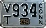 1937–41 | Embossed black serial on silver plate; vertical "CONN" at right; tab box at bottom center | 1234 | 1 to 9999 | Validated for 1937, 1940 and 1943 with yellow tabs; for 1938, 1941 and 1946 with silver tabs; for 1939, 1942, 1945 and 1947 with light green tabs; and for 1944 with white tabs. In the A/1 123 serial format, the letter progressed before the small number (A/2 through Z/2, then A/3 through Z/3, etc.).[3] |