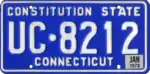 Embossed dark blue serial on reflective gradient sky blue and white plate with dark blue border line; "Connecticut" screened in dark blue centered at top; screened dark blue state shape at top left | "Constitution State" screened in dark blue centered at bottom | 123·ABC2 | 100·NZN to 999·ZZX | 'O' series not used; 'V' series reserved for Veteran plates. |
