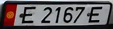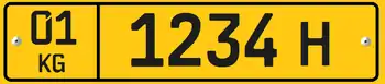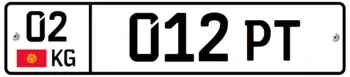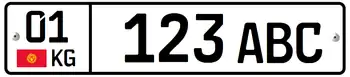 The license plates have the format ## - ### xxx, where the first two digits are province codes. The plate is black on white. Right under the province codes, there is the Kyrgyz flag and the code KG.