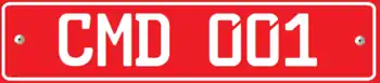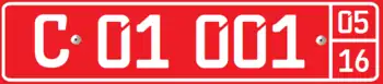 Diplomatic license plates are white on red, whereas the license plates for UN vehicles are white on blue. The license plates have the format L ## ###. The letter could be any of the following: