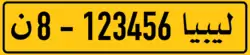 Commercial vehicle license plates are black on yellow and follow the format [ن# - 1 to 999999]. Commercial vehicles consist of trucks, buses, vans, but not taxis, and not semi-trucks. The plate starts with the Arabic letter ن (N),followed by number (#), a 1 or 2 digit number consists of a code corresponding to Municipality in Libya. This number is separated by a dash from the registration code, which can be 1 to 6 digits. On a two-line plate, the positioning of the Arabic letter-code is bottom left of the license plate.