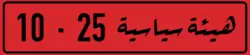 Diplomatic and consular license plates are black on red, and follow the format [1 to 99 - NN هيئة سياسية]. This type of plate does not have "ليبيا" (Libya) written on it, but instead, "هيئة سياسية", in Ruqʿah script. This means "Political Corps". The format of this license plate consists of a 1 or 2 digit number, separated by a dash from a 2 or 3 digit code indicating the country of the owner of the vehicle (NN). This code is identical to that used for Foreigner-owned private vehicles.