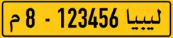 Libya requires its residents to register their motor vehicles and display vehicle registration plates.[1] Current plates are European standard 520 mm × 110 mm.