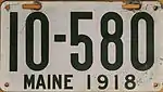 1918 | Dark green serial on white flat metal plate; "MAINE 1918" centered at bottom | none | 12-345 | 1 to approximately 42-000 | |