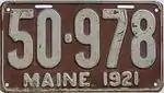 1921 | Embossed white serial on maroon plate with border line; "MAINE 1921" centered at bottom | none | 12-345 | 1 to approximately 68-000 | |