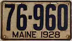 1928 | Embossed dark blue serial on white plate with border line; "MAINE 1928" centered at bottom | none | 123-456 | 1 to approximately 140-000 | |