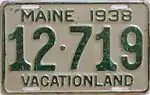 1938 | Embossed dark green serial on light green plate with border line; "MAINE 1938" centered at top | "VACATIONLAND" centered at bottom | 123-456 | 1 to approximately 157-000 | |