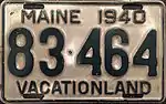 1940 | Embossed dark green serial on silver plate with border line; "MAINE 1940" centered at top | "VACATIONLAND" centered at bottom | 123-456 | 1 to approximately 165-000 | |