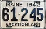 1942–43 | Embossed black serial on beige plate with border line; "MAINE 1942" centered at top | "VACATIONLAND" centered at bottom | 123-456 | 1 to approximately 177-000 | Revalidated for 1943 with windshield stickers, due to metal conservation for World War II. |