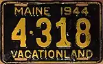 1944 | Embossed yellow serial on black plate with border line; "MAINE 1944" centered at top | "VACATIONLAND" centered at bottom | 123-456 | 1 to approximately 155-000 | |