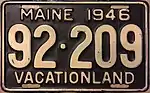 1946–47 | Embossed white serial on dark blue plate with border line; "MAINE 1946" centered at top | "VACATIONLAND" centered at bottom | 123-456 | 1 to approximately 204-000 | Revalidated for 1947 with windshield stickers. |