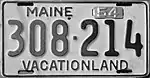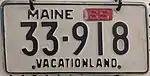 1950–55 | Embossed black serial on reflective white plate with border line; "MAINE" at top, offset to left, with metal tab slots to right | "VACATIONLAND" centered at bottom | 123-456 | 1 to approximately 376-000 | Validated for 1950 with silver tabs, for 1951 with red tabs, for 1952 with green tabs, for 1953 with gold tabs, for 1954 with silver tabs, and for 1955 with blue tabs. |