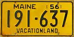 1956 | Embossed black serial on reflective gold plate with border line; "MAINE 56" centered at top, with metal tab slots either side of year | "VACATIONLAND" centered at bottom | 123-456 | 1 to 264-000 |