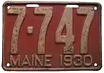 1930 | Embossed white serial on red plate with border line; "MAINE 1930" centered at bottom | none | 123-456 | 1 to approximately 150-000 | |