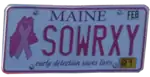 Breast Cancer | October 1, 2008 – present | Embossed pink serial on white plate with border line; pink ribbon on magenta state icon screened at left; "MAINE" screened in purple centered at top | "early detection saves lives" screened in purple centered at bottom | ALA–ALZ, ATA–ATZ, AYA–AYZ | Proceeds go towards the Breast Cancer Services Special Program Fund of the Maine Center for Disease Control and Prevention. |