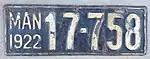 1917 | White serial on black flat metal plate; provincial shield at left with "MAN. 1917" below | 12345 | 1 to approximately 18600 | |